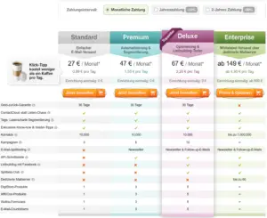 Leider bietet Klick Tipp keinen kostenlosen Testzeitraum an. Das günstigste Paket kostet 27 € im Monat und ermöglicht die Verwaltung von bis zu 10.000 Kontakten, sowie das Versenden einer unbegrenzten Anzahl an E-Mails. Zusätzlich stehen ein Premium- (47 € / Monat), Deluxe- (67 € / Monat) und Enterprise-Paket (149 € / Monat) mit weiteren Funktionen und einer höheren Anzahl an Kampagnen zur Auswahl.